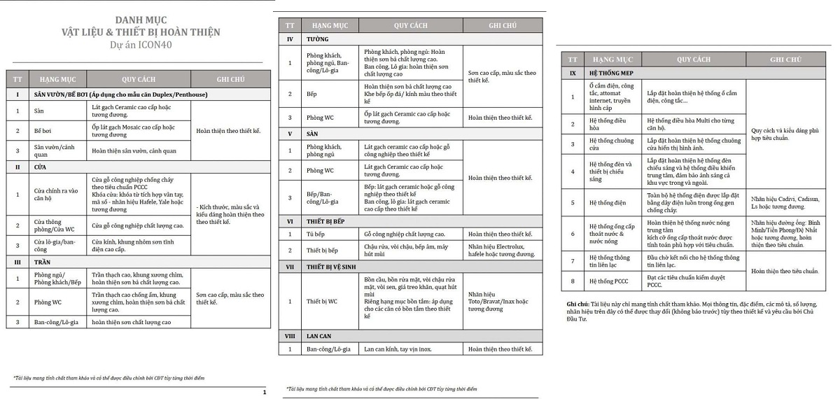 Tiêu chuẩn bàn giao của căn hộ ICON 40 Hạ Long sẽ bao gồm các hạng mục sau: