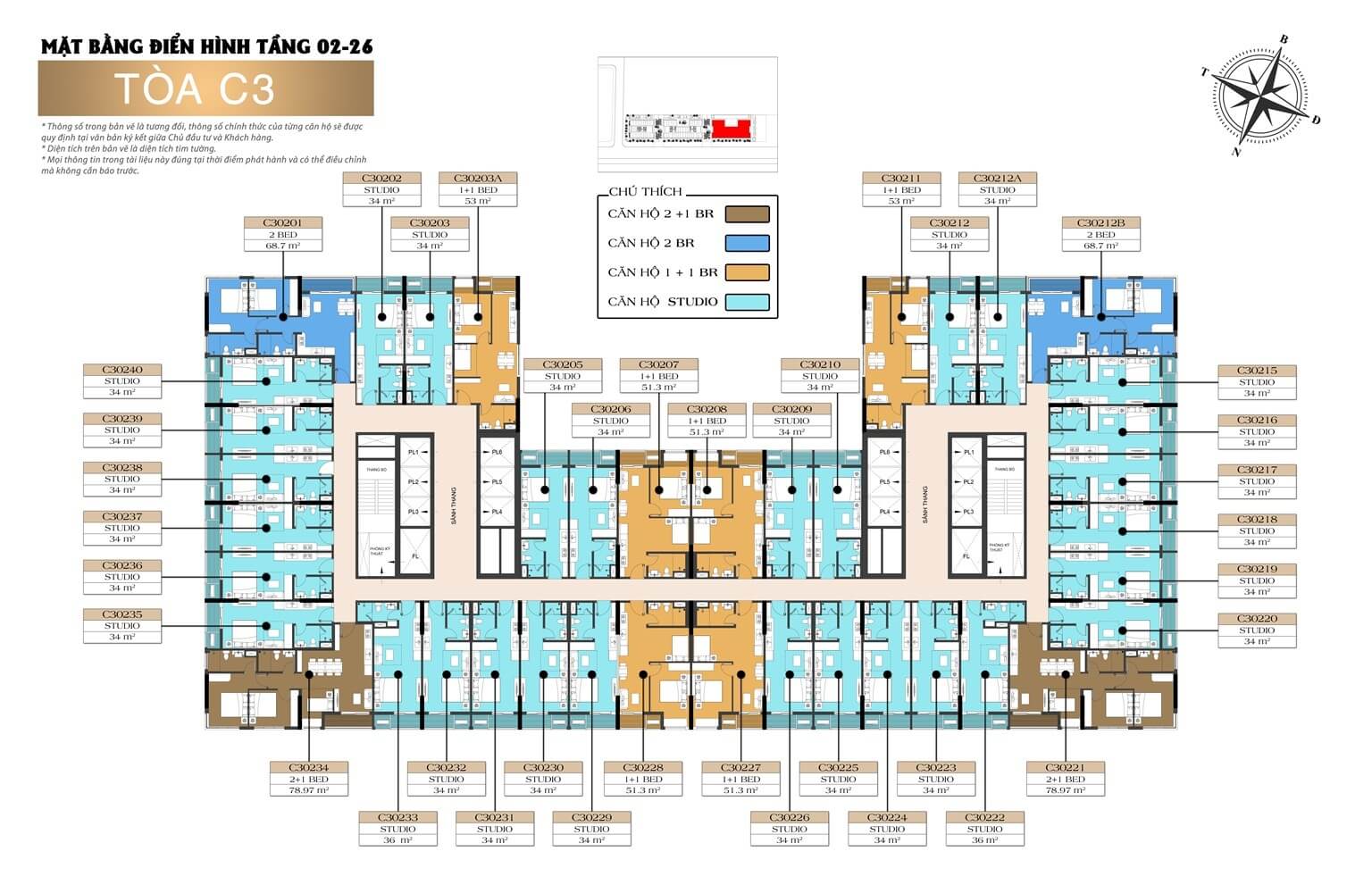 Tầng 2–29 (trần cao 3,5m): Căn hộ đa dạng từ Studio đến 3PN.